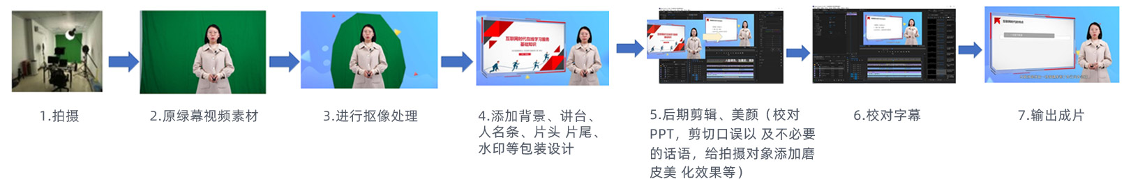 具有一套完善且专业的制作流程,从前期拍摄到后期制作。 亮点:具有片头、章节知识点信息、字幕、可手 写、重点内容可 放大标注、人物可美颜等内容及功能;最终成片添加水印以防止被盗用。