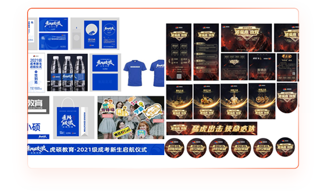 提供全套活动物料设计,包括但不限于刀旗、户外kv、签名墙、易拉宝、立体字、台卡、KT板、 横幅灯布、定制矿泉水、礼品袋、文化衫、主持人手卡、邀请 函(嘉宾)、电子邀请函(学员)、学员姓名牌(可贴) 手带等